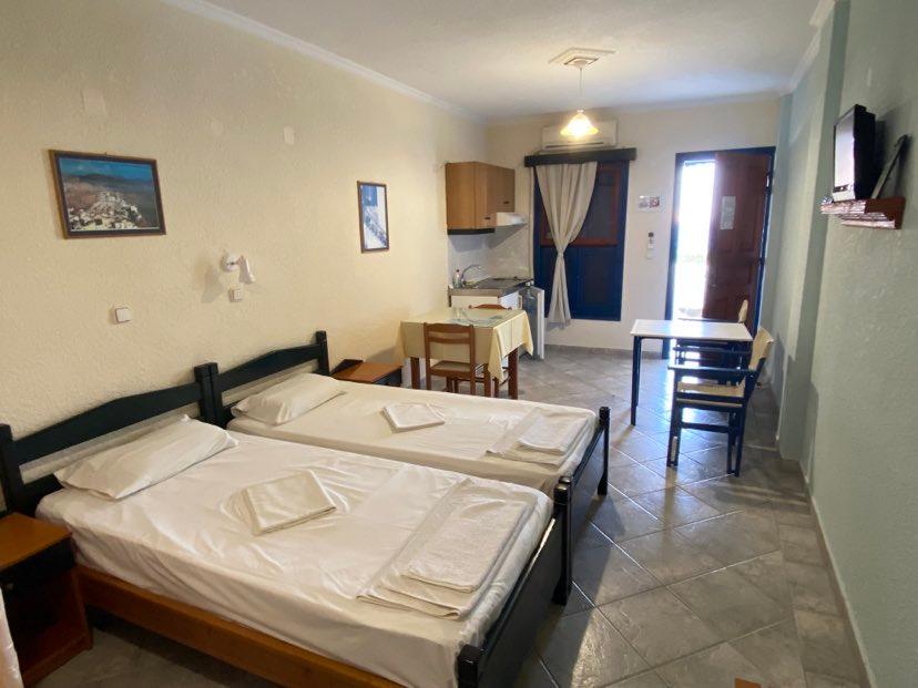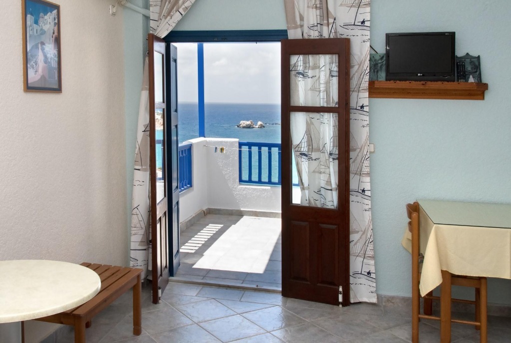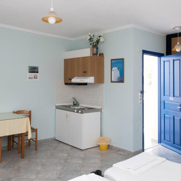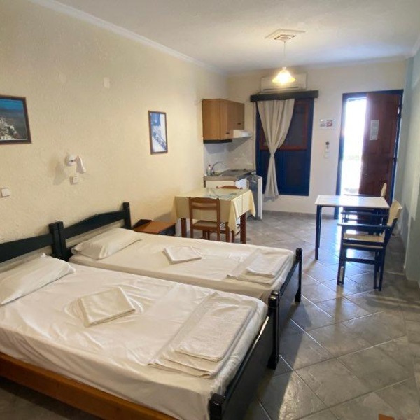 Studio: klimatska naprava (plačilo, 8€/dan), kopalnica z wc-jem, sušilec za lase, spalno bivalni prostor s kuhinjsko nišo in mini hladilnikom, telefon, tv, sef (plačilo, 2 €/dan), balkon ali terasa, morska stran. Možni dve dodatni ležišči.